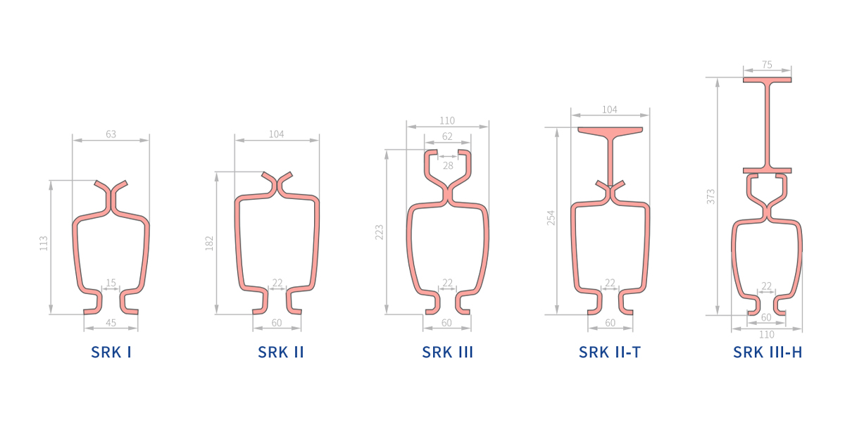 | SRK II-T | Vysokopevnostná mäkká oceľ | 26,6 kg/m | 33,88 cm² | 2380 cm⁴ | Nie je vybavený pevnými koľajnicami | Nasledujúci graf | Vlastná veľkosť | RAL2002 |
