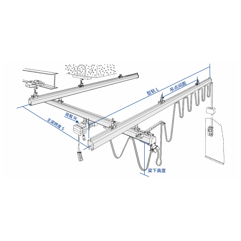 · Výška lúča: Vzťahuje sa to na výšku hlavného nosníka, kde je vozík zavesený na kladkostroji (pri voľne stojacich konštrukciách sa zvyčajne počíta z podperného bodu zeme alebo stĺpa).